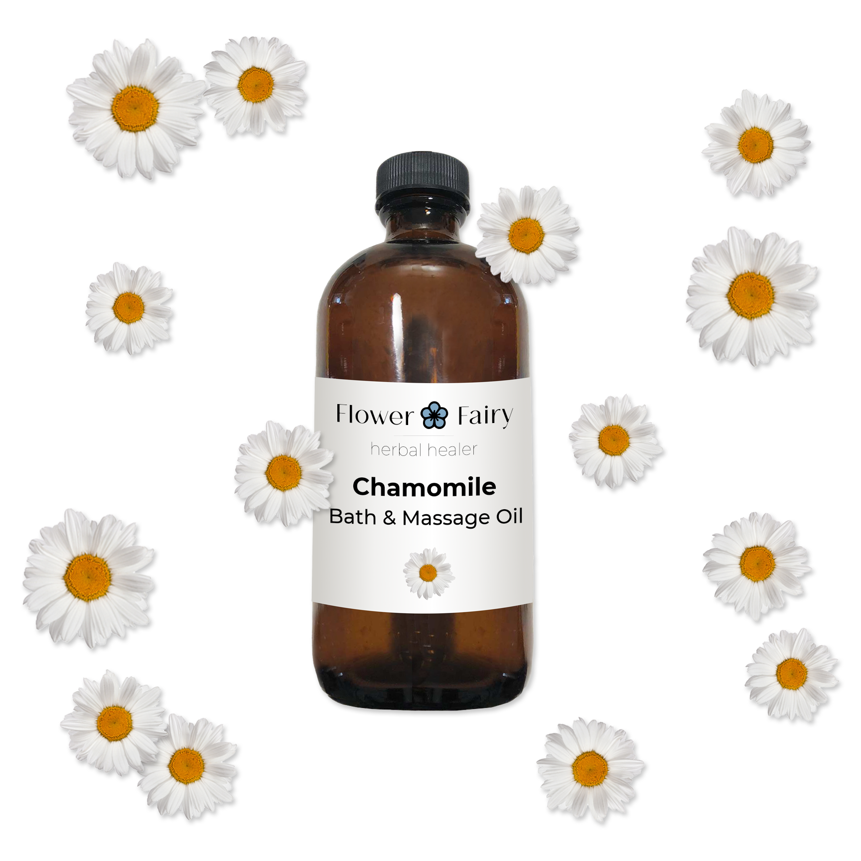 Ingredients: Cold pressed sunflower seed oil, 100% certified organic, fair-trade, pure & natural organic essential oils of Roman/German/Blue Chamomile, natural vitamin E oil, & jojoba oil. We use only Roman and German & Blue chamomile (not the inexpensive families with fewer medicinal properties). Packaged in cobalt blue/dark glass bottle.