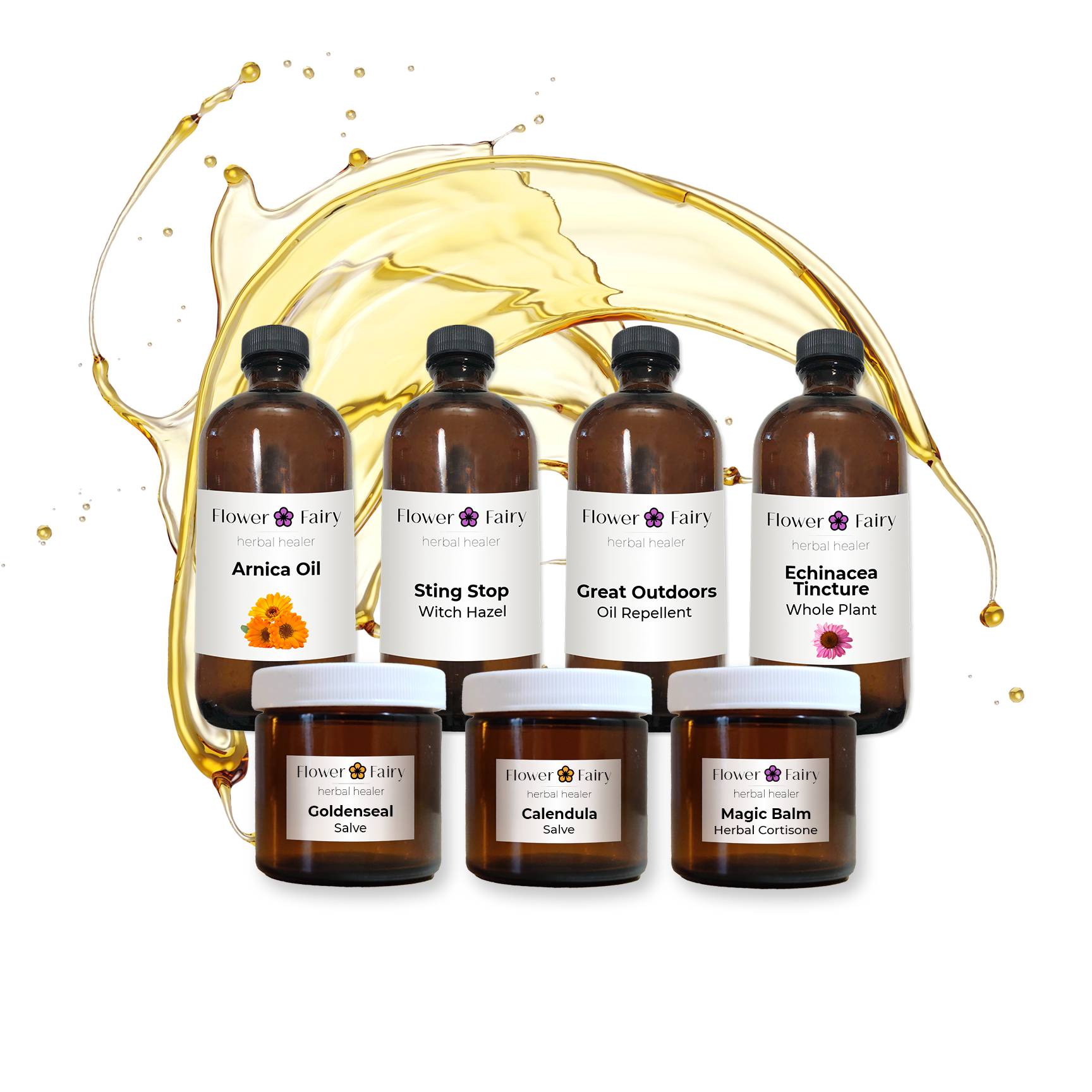 Ingredients: Flower Fairy Herbal First Aid kit have a hand-made and effective combination of 3 medicinal salves and one arnica oil, one witch hazel based Sting Stop drops. They have a range of uses for topical application for non-poisonous bites, mild burns, rashes, scrapes, chaffing, bumps, bruises, sprains, trauma, eczema, nettle burn, stings , fungal & candida conditions, baby rash, dry skin, dermatitis, itching, hemorrhoids and chapped lips. Also contains one herbal bug repellant, one bottle of allergy/immune tonic of echinacea. Packaged in an attractive plastic travel case. All products have ingredients and directions on their labels. (Item may vary from photo)